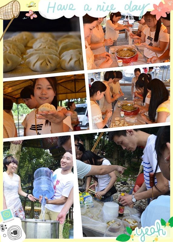 為了讓大家有個(gè)開心的午飯,一些同事積極幫忙搬水、搬水果和燒烤食材,心靈手巧的女同事們也現(xiàn)場(chǎng)包起了餃子,來自不同區(qū)域的人包出來的餃子也是各具風(fēng)采,有永康本地的傳統(tǒng)餃子,也有“花邊”餃子,看,連沙縣小吃的蒸餃也有。相對(duì)于女同事的“悠哉”,男同事也發(fā)揮了其特長(zhǎng),扛水、撿柴、生火,惹得大家紛紛點(diǎn)贊。